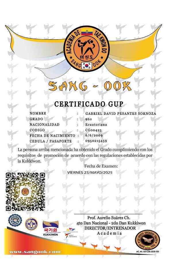 Cinturones Para validación de los grado gup emitido por está Academia marcial ..Debe reposar el diploma tanto de manera virtual en la web como en físico. Certificados diplo-tkd » gabriel-david-pesantes-sornoza-tkd